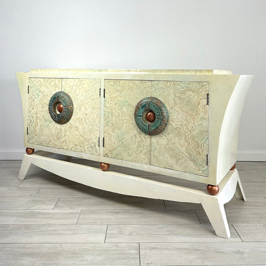 Brutalist Credenza With Hand-Painted Faux Marble and Patinated Bronze Medallion, Late 20th Century