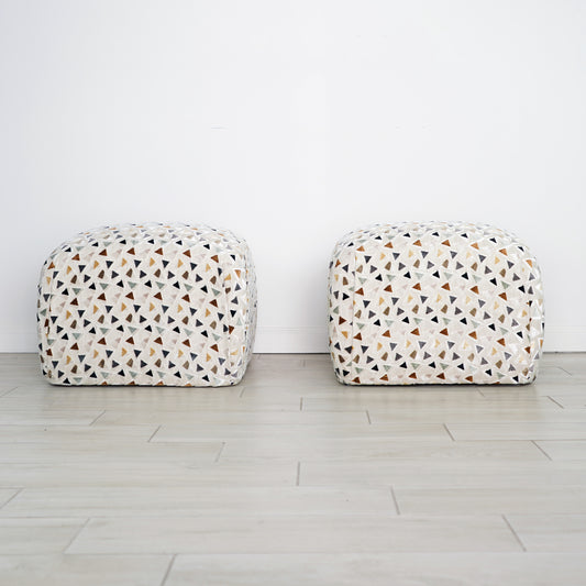 Mid 20th Century Soufflé Pouf Ottoman Pair After Karl Springer in Kravet Trio Tango Fabric