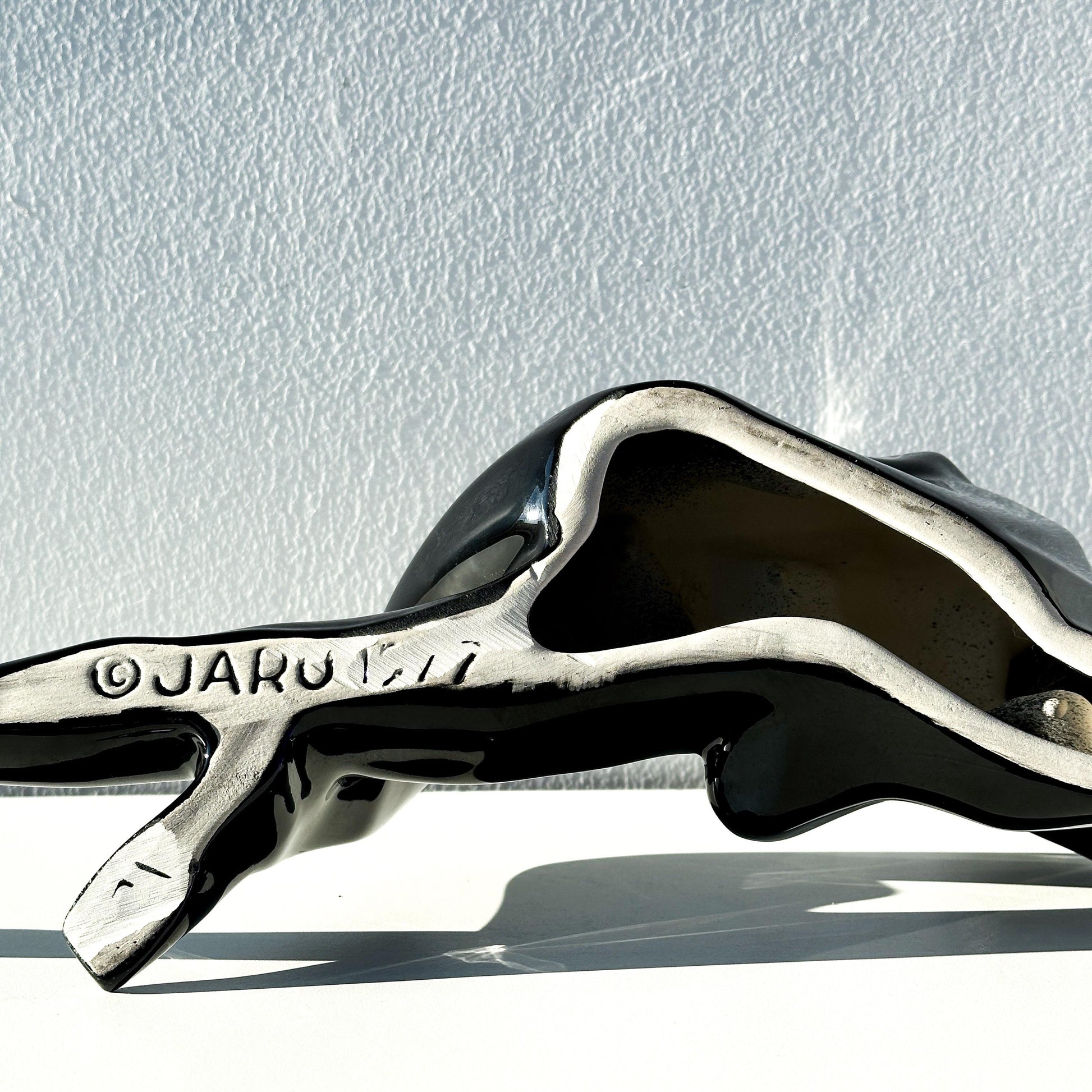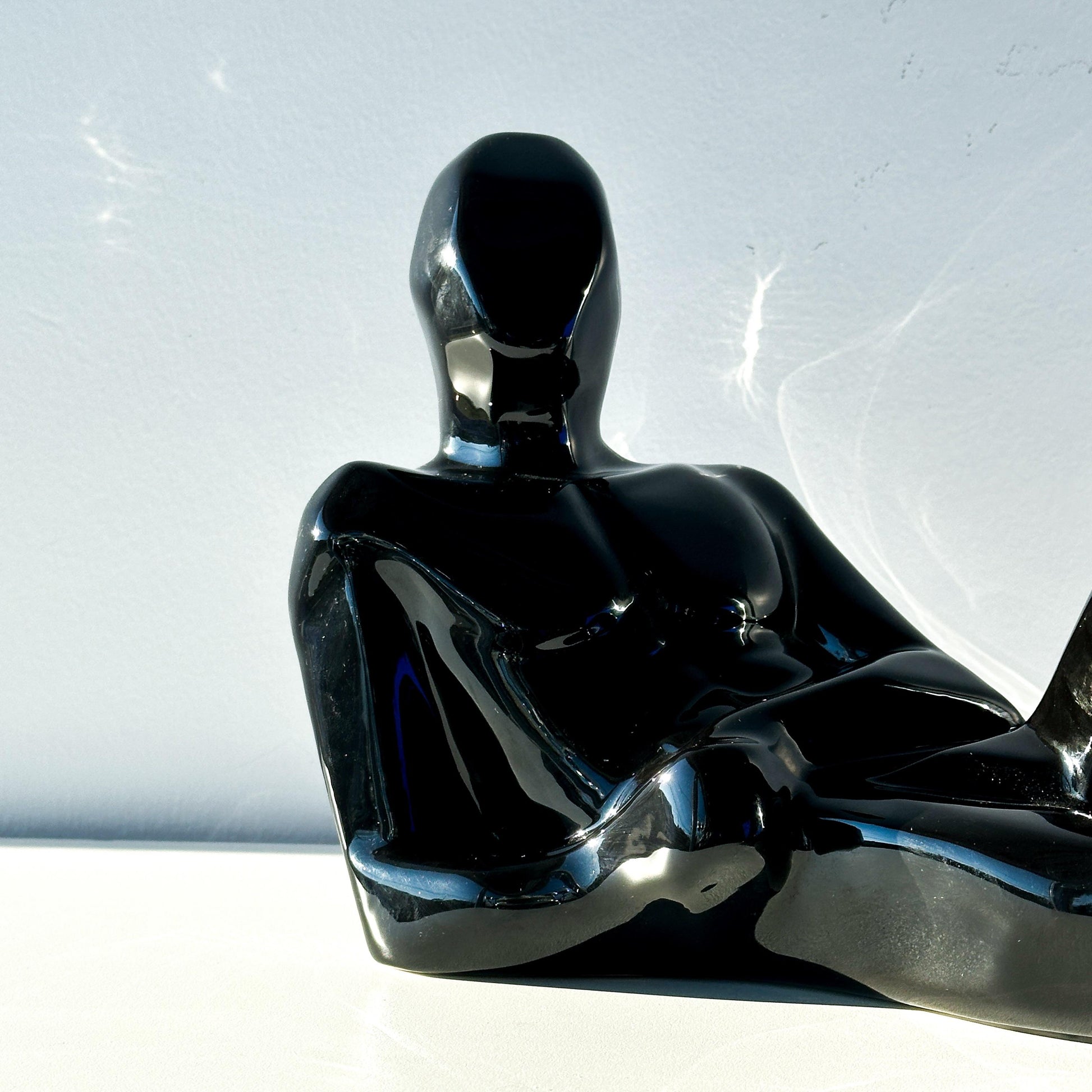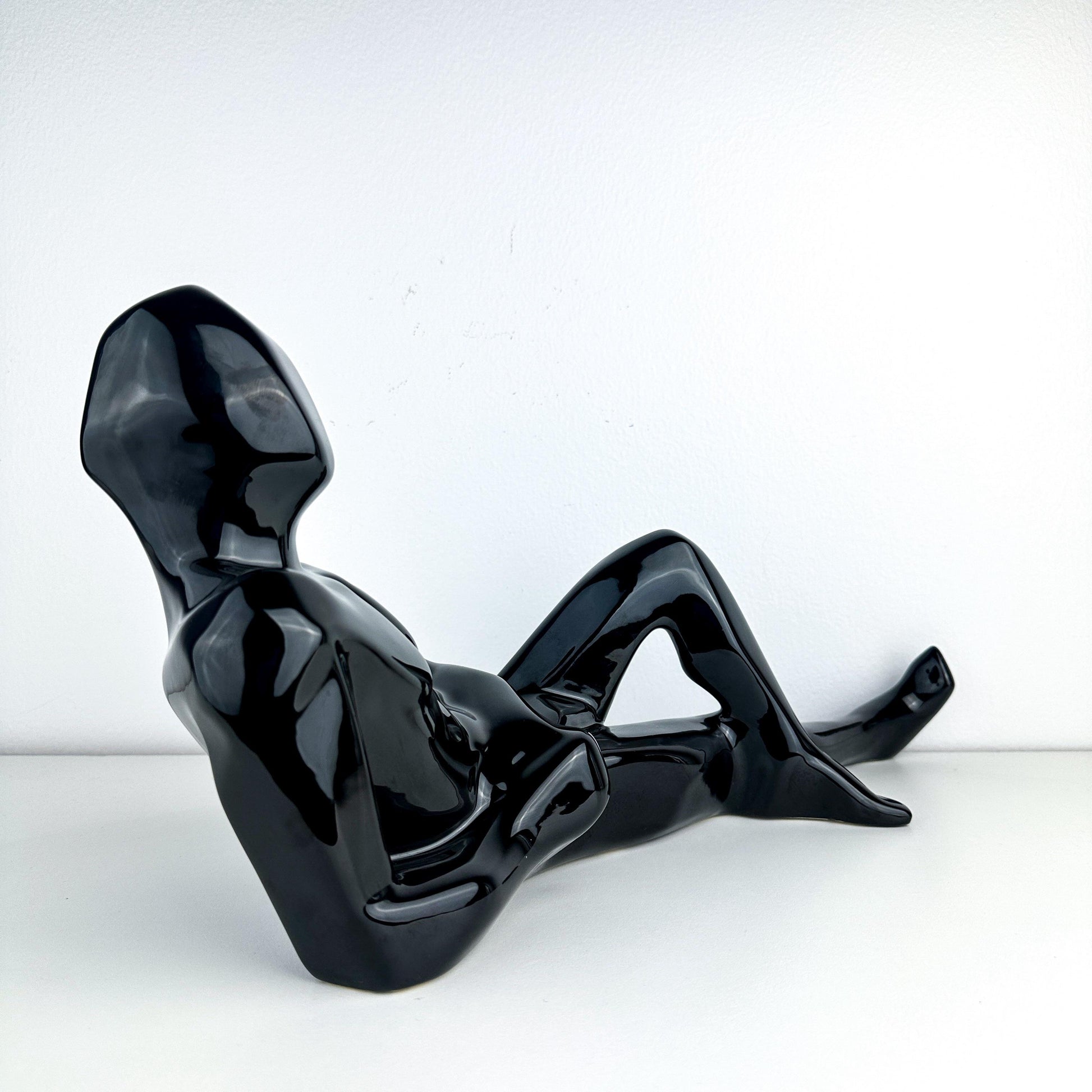 Vintage 1977 Jaru of California ceramic reclining male nude sculpture. Cubism combines with postmodern design influence. Black glaze and excellent condition.