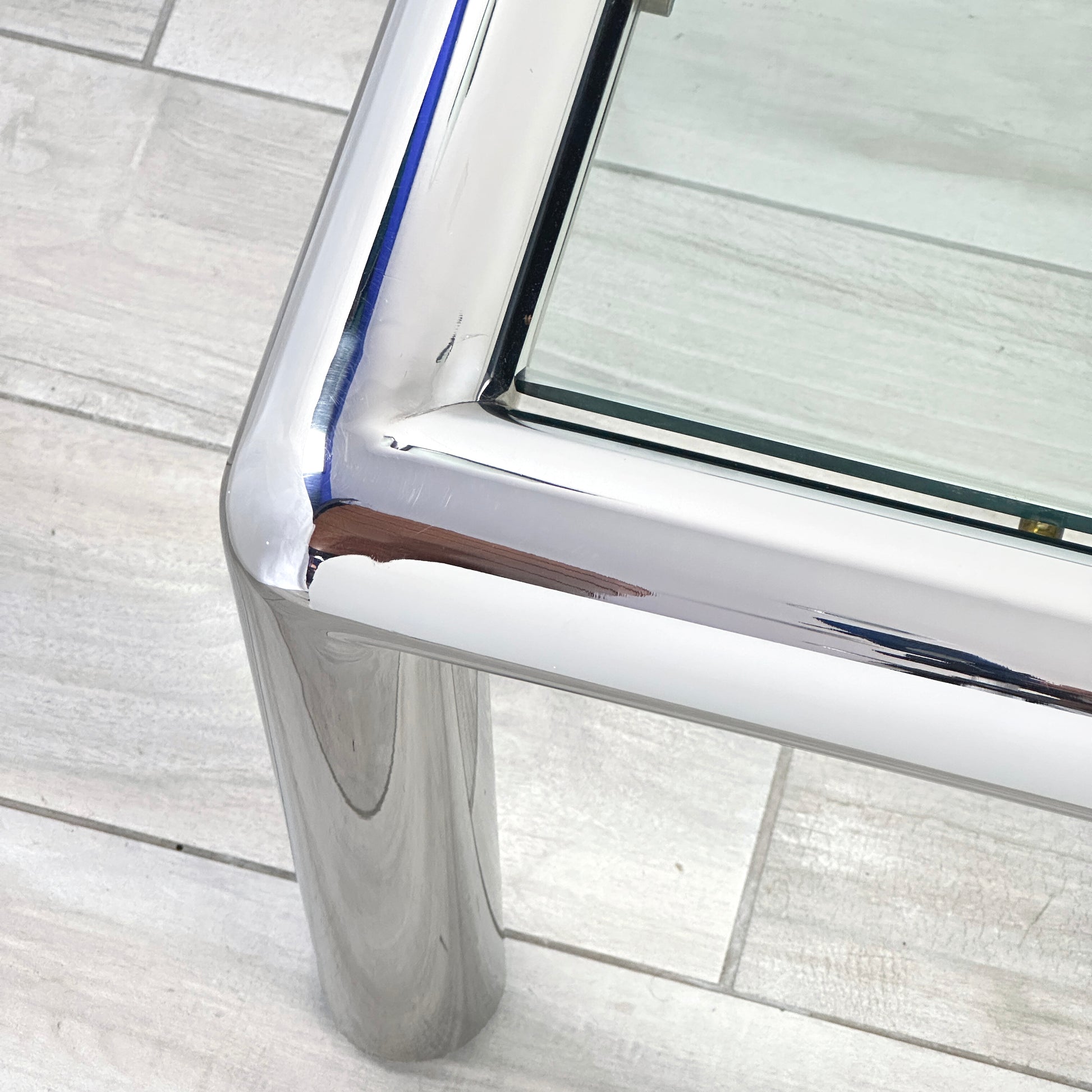 Vintage circa 1970s John Mascheroni Tubo coffee table. A seamless chrome tube base with a 1/4 inch glass with slight green tint. Table has adjustable feet for easy leveling and is in excellent condition with minimal wear and tear. This coffee table is a perfect statement size for a living room or lounge.