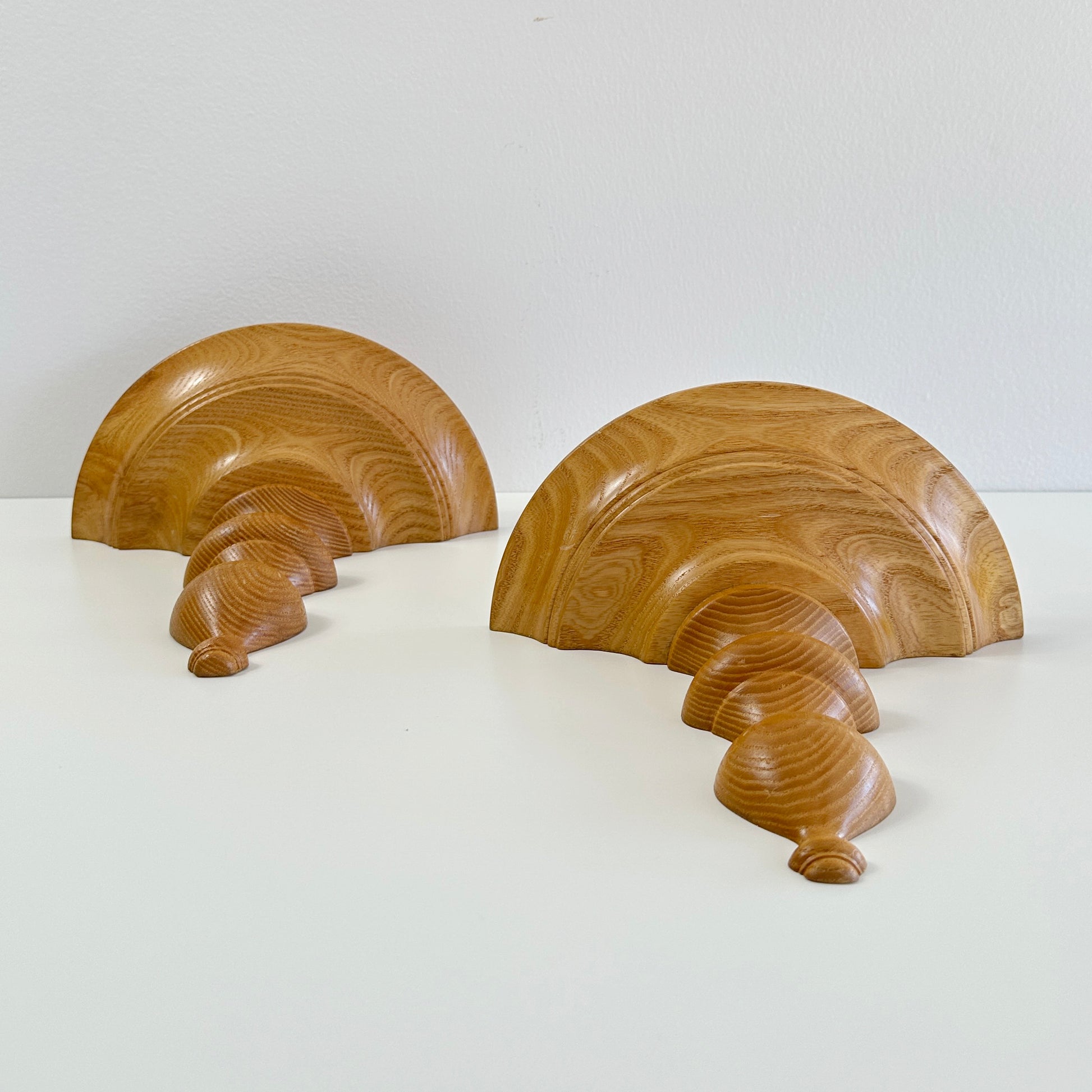 Vintage circa mid 20th century pair of carved wood wall-mounted sconce shelves. Hand-carved oak wood shelves in excellent vintage condition. Oak wood has excellent grain pattern with almost op art rings. Measurements are per shelf.